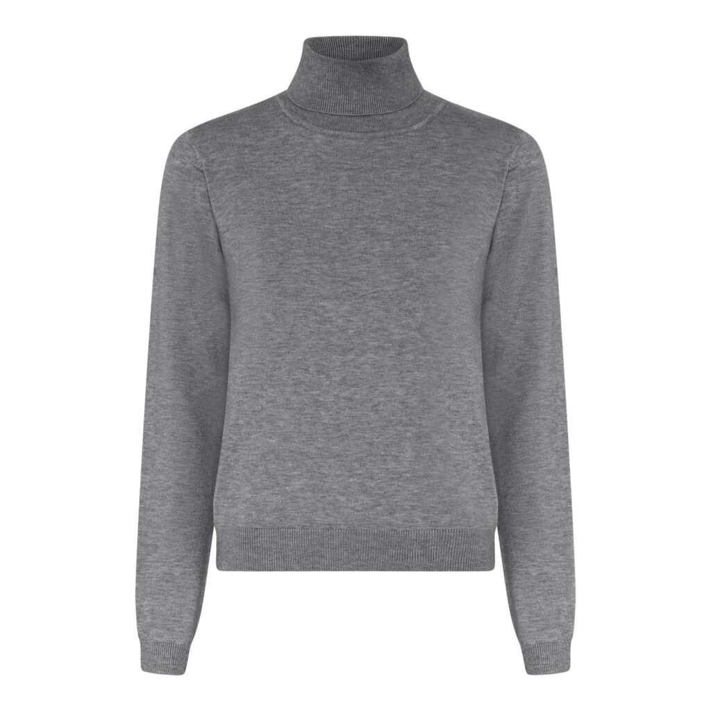 Høy hals. Har inne i rosa, sand og grå.