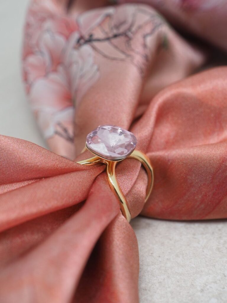 Har det inne i fargene rosa, sand, grå og sort.
